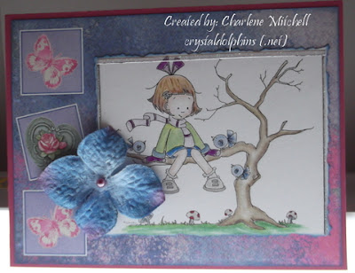 Charlene Mitchell used an adorable image from artist Cheryl Alger called Sassy Sally's Winter Morning Special. I just love to see the transition on her card from winter to spring via the flower and butterfly decor. Kind of makes me think of the weather I am seeing here now, it's so warm some days immediately followed by that day with the chill in the air.